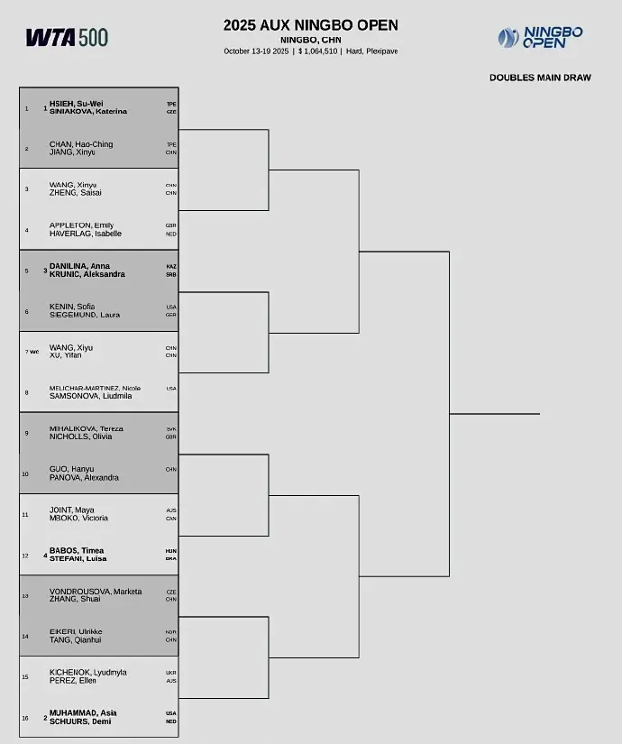 双打签表:蒋欣玗/詹皓晴 vs谢淑薇/西尼亚科娃、王欣瑜/郑赛赛 vs 阿普尔顿/哈弗拉格、王曦雨/徐一璠 vs 梅里查尔/萨姆索诺娃、郭涵煜/帕诺娃 vs 米哈利科娃/尼科尔斯、张帅/万卓索娃 vs 汤千慧/艾克里。祝金花们好运!